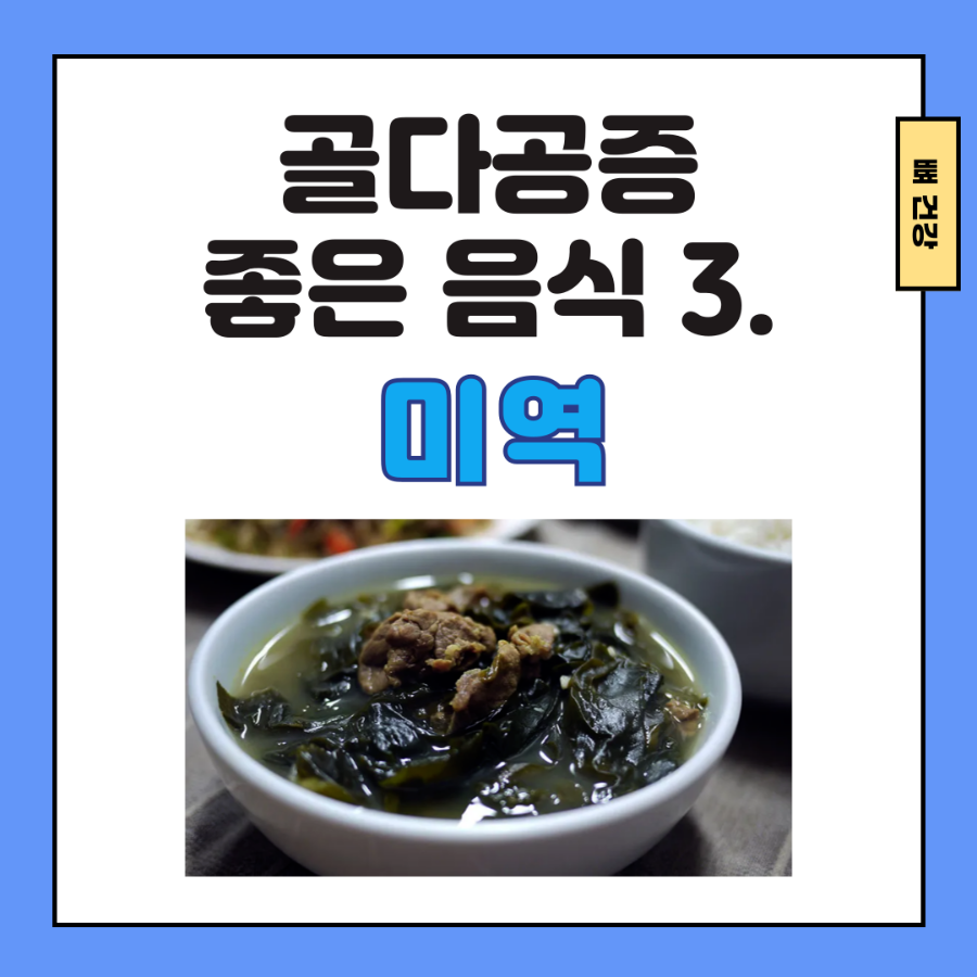 미역은 칼슘과 마그네슘, 요오드가 풍부한 식품으로 뼈 건강에 도움을 주기 때문에 골다공증에 좋은 식품입니다. 생미역에는 100g당 칼슘 함량이 149mg이며, 미역에 함유되어 있는 마그네슘은 칼슘의 대사를 돕기 때문에 뼈에 도움을 줍니다.