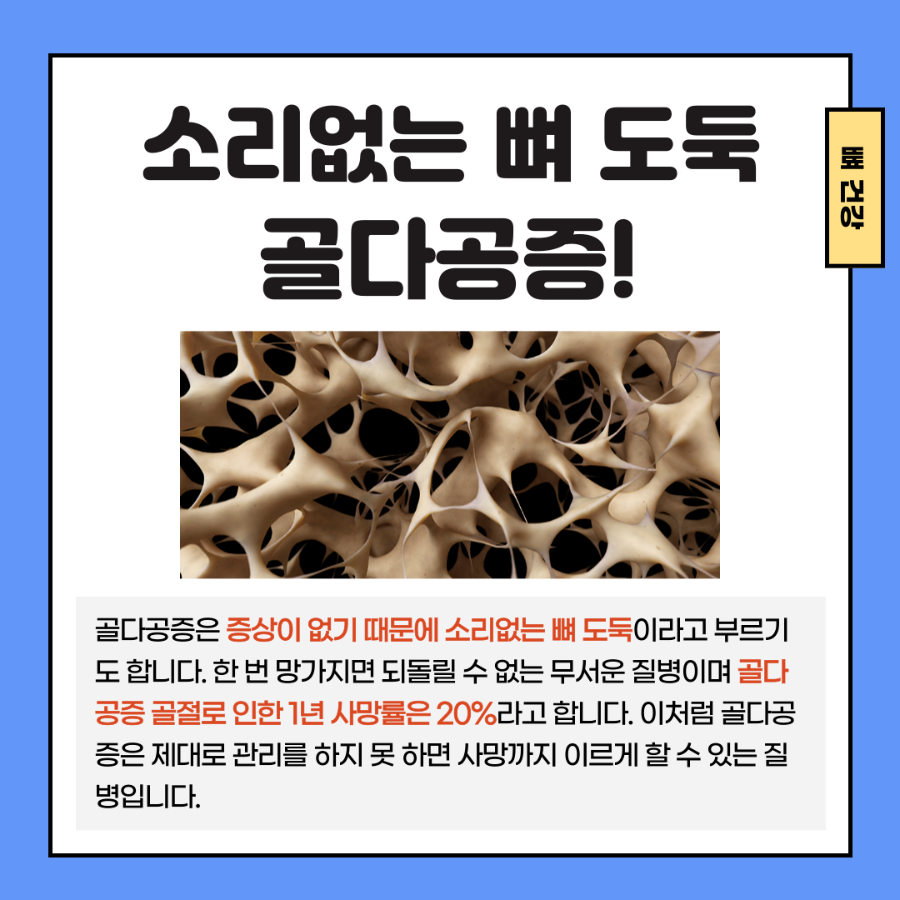 골다공증은 소리없는 뼈 도둑이라고도 불리는데요. 무릎관절염의 경우에는 관절이 아프면 관절이 좋지 않구나 하며 알아차릴 수 있는데 골다공증은 사전에 증상이 없습니다. 골절이 되어야만 그제서야 뼈건강이 좋지 않구나를 알 수 있는 것이죠.
