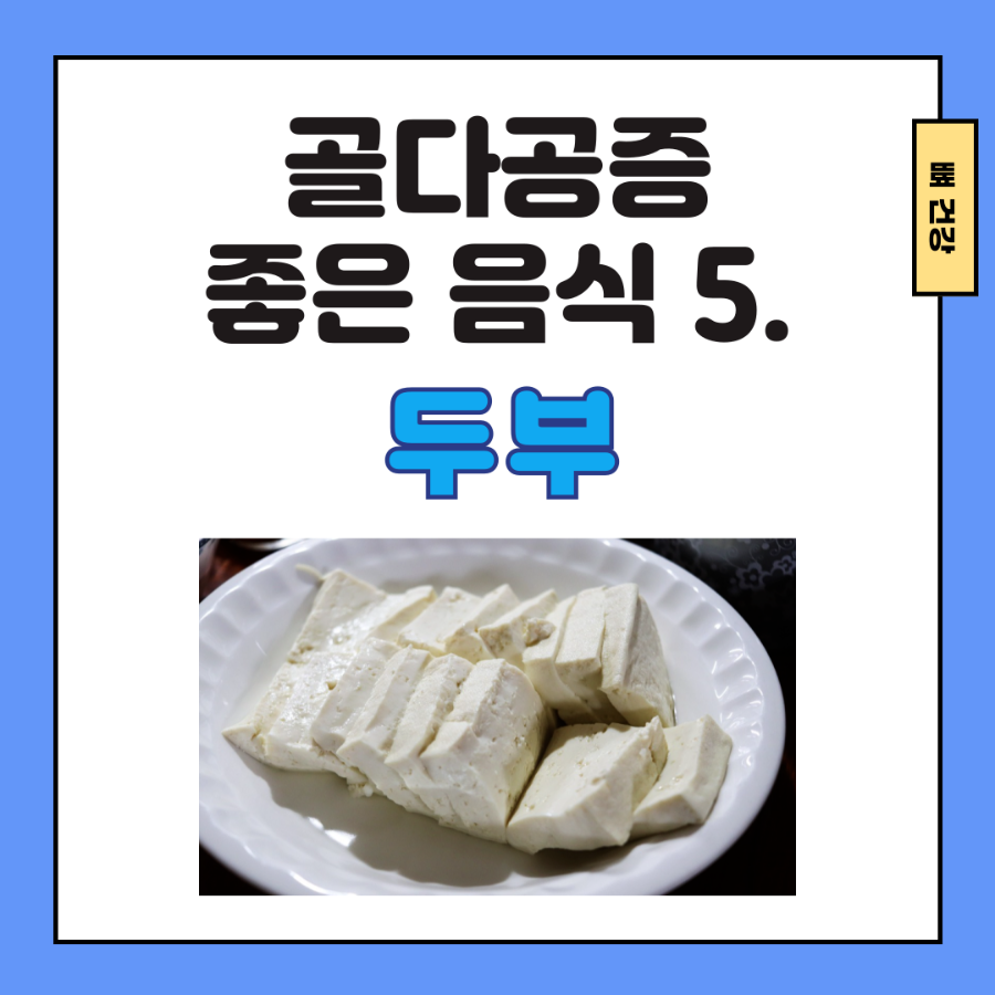 두부는 칼슘과 식물성 단백질이 풍부하게 들어있어 뼈건강과 골다공증에 도움을 줍니다. 두부 100g에는 칼슘이 64mg 함유되어 있는데요. 특히 두부에는 이소플라본이라는 성분이 함유되어 있습니다. 이 이소플라본은 골밀도를 유지하는데 도움을 주기 때문에 골다공증 예방에도 도움이 됩니다.