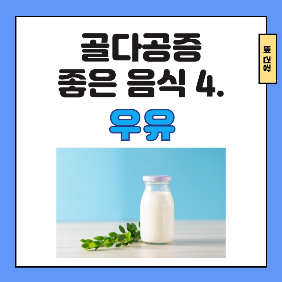 뼈 건강 하면 생각나는 대표적인 식품이죠. 바로 우유입니다. 우유는 칼슘과 비타민D, 단백질이 풍부한 식품입니다. 그래서 뼈를 성장시키고 유지시키는데 필수인 식품인데요. 흰 우유 100g에는 칼슘이 113mg 함유되어 있으며 규칙적으로 섭취하면 골밀도 향상에 도움이 되고 골다공증에도 도움이 됩니다.