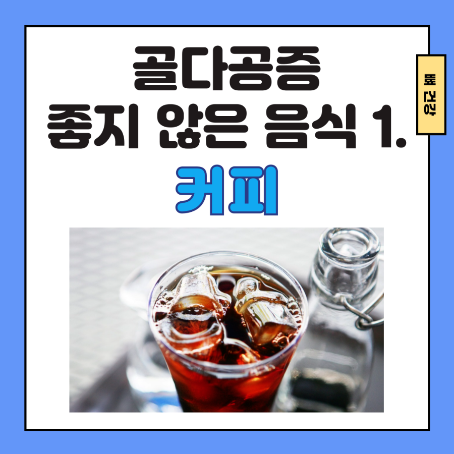 많은 분들이 알고 계시듯 커피에는 카페인이 들어있습니다. 그래서 일하시는 많은 분들에게 포션으로 불리기도 하는데요. 많은 사람들의 일의 능률을 도와주는 이 카페인은 골다공증에겐 좋지 않은 적이 될 수도 있습니다. 커피 속 카페인은 소변을 볼 때 그냥 배출되지 않고 칼슘을 함께 배출합니다. 칼슘은 우리 뼈의 구성을 도와주는 중요한 성분인데요. 칼슘을 함께 데리고 배출해버리니 우리 몸은 뼈를 구성해야 하는 칼슘이 부족할 수 밖에 없기 때문에 골다공증에 좋지 않습니다. 여러분 믹스커피 좋아하시나요? 저도 평소에는 잘 안 먹지만 당이 떨어지는 날에는 얼음 가득 넣고 믹스커피 2개 타서 아이스믹스커피로 만들어먹으면 정말 너무 맛있어서 저도 좋아하는데요. 믹스커피는 더 심한 뼈도둑의 주범입니다. 믹스커피에는 카페인 뿐만 아니라 인산이라는 성분도 들어있습니다. 인산은 칼슘의 흡수를 방해하는 역할을 하기 때문에 뼈 도둑의 심한 주범이 될 수 있습니다. 그러니 커피는 과도하게 먹지 말고 주의해서 적당량 드시는 것이 좋습니다.