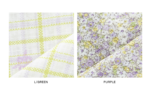 그린색상은 연두색의 체크무늬에 보라색 포인트가 들어가 있고, 퍼플색상은 전체적으로 흰색, 연두색, 보라색의 잔꽃들이 있는 색상이네요.