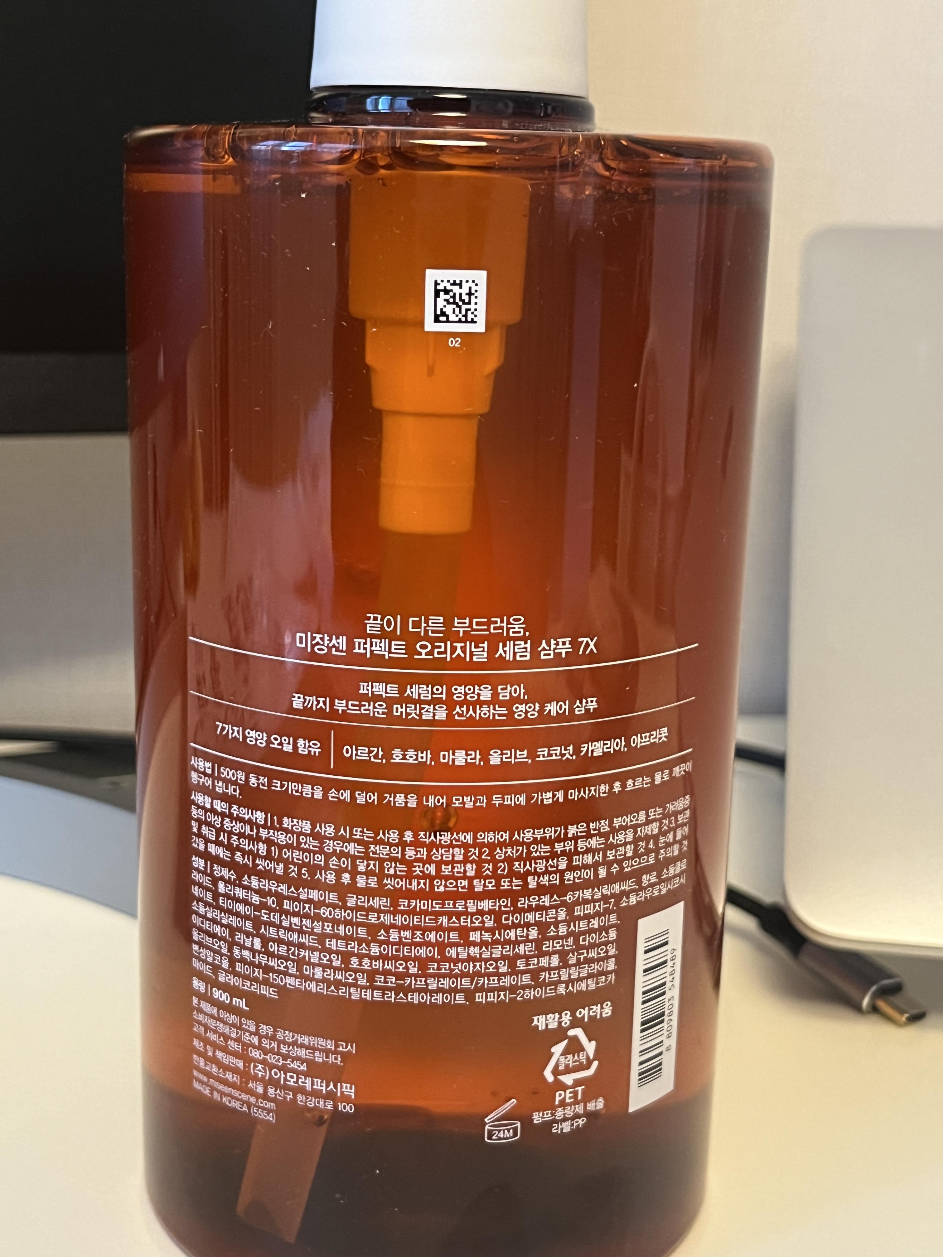 혹시나 성분 궁금하신 분들을 위해 자세히 찍어봤어요. 퍼펙트 세럼의 영양을 담았다고 하네요. 그래서 부드러운가..? 용량은 900ml의 대용량입니다!