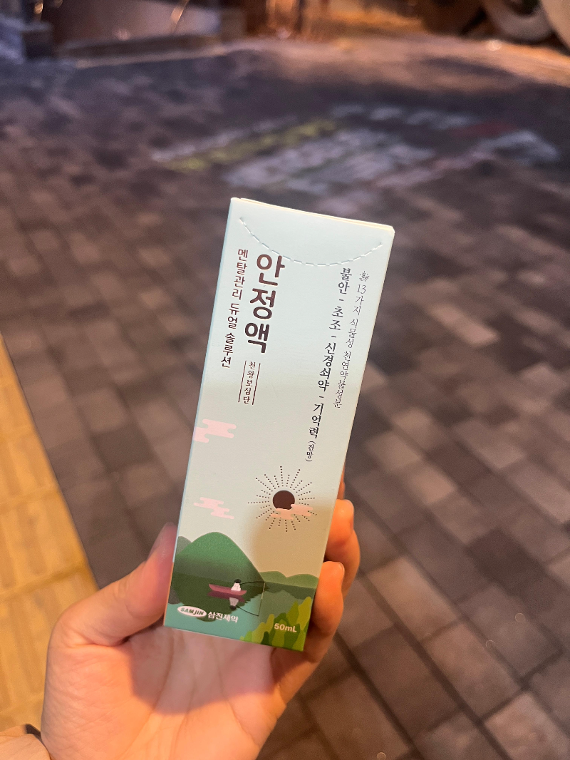 그러던 어느 날, 너무 많은 생각들이 일어났고 불안감이 엄습해왔다. 너무 힘들어서 안되겠다 싶어 집 근처 약국에 전화를 걸어 안정액이 있는지 여쭤봤다. 괜시리 뭔가 민망하고 부끄러웠음..ㅎㅎ 근데 전혀 그럴게 아닌데 말이지..ㅎㅎ 약사님이 친절하게 답해주셨고 금액을 여쭤봤는데 정확한 금액을 전화로 알려주진 않으신다고 한다. 괜히 비쌀까봐 걱정했는데 미리 알아본 바로는 3천원~6천원 사이라고 하길래 일단 가봤다!