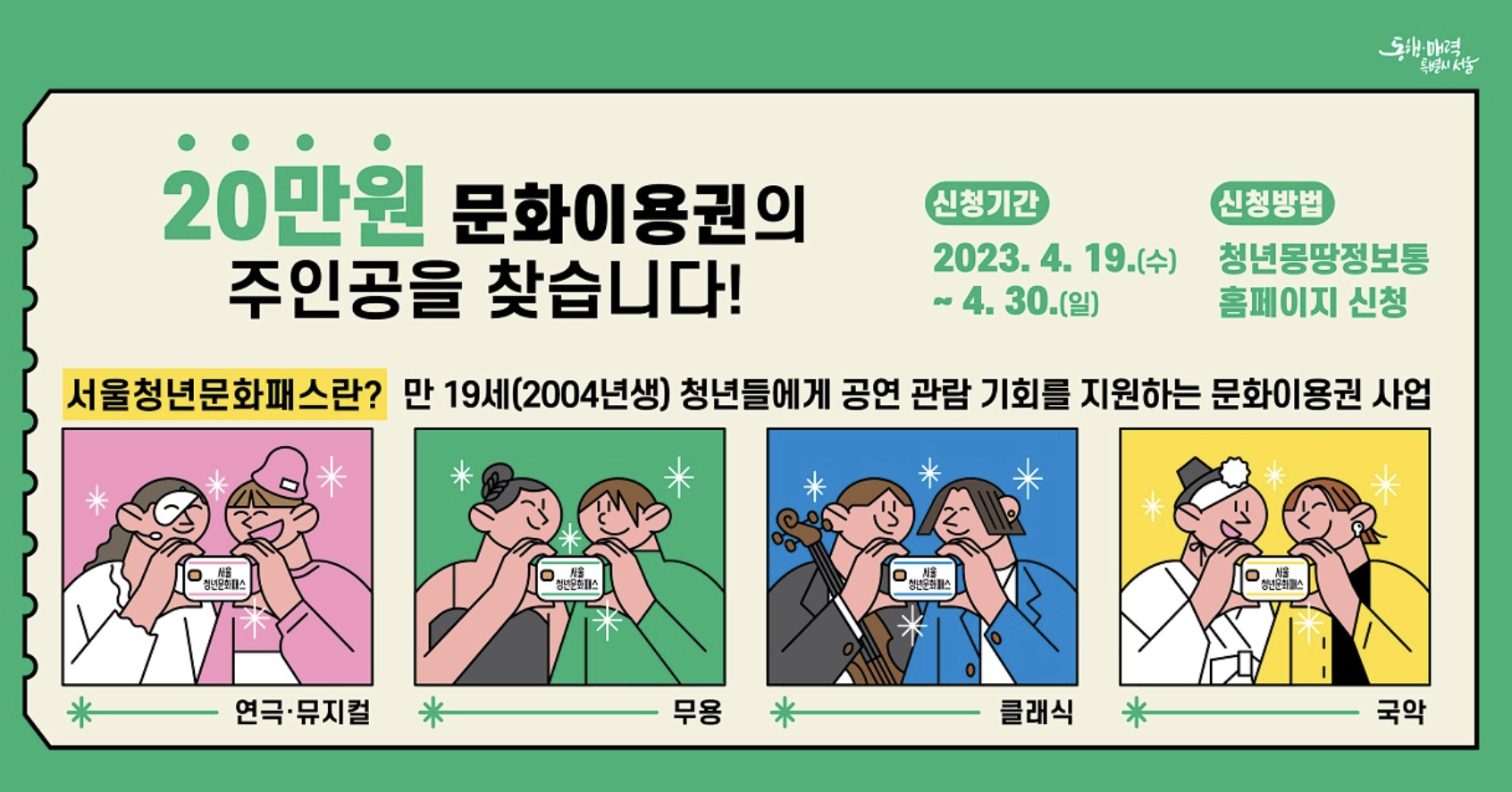 - 신청방법 : 청년몽땅정보통 홈페이지 접속 후 '서울청년문화패스' 온라인 신청 및 접수