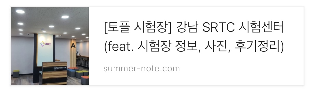 [토플 시험장] 강남 SRTC 시험센터 (feat. 시험장 정보, 사진, 후기정리) (0) | 2023.07.18 |