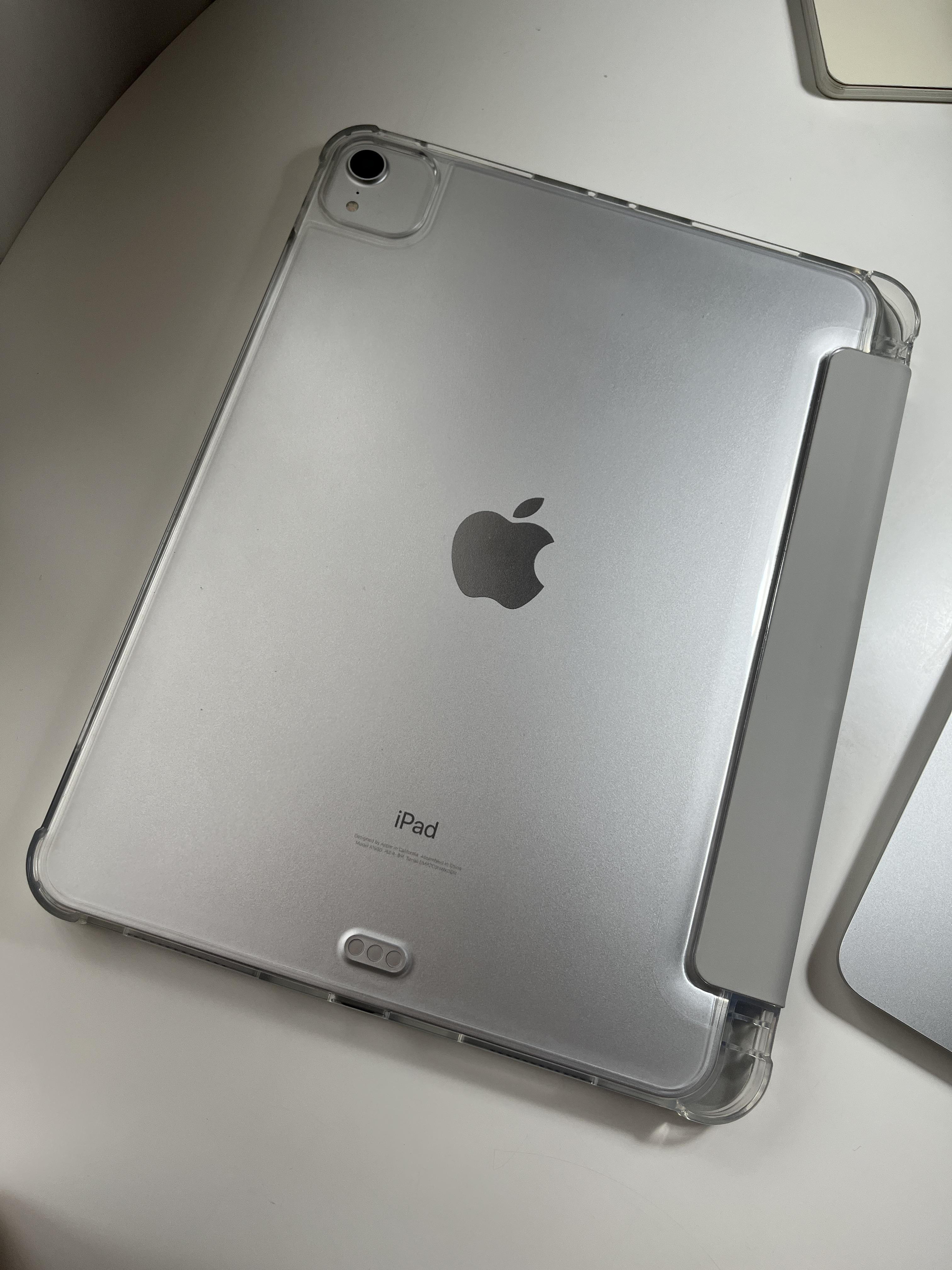 케이스를 끼운 후 뒷면 모습입니다. 그레이 색상이 실버 아이패드와 잘 어울렸어요! 보호색처럼 찰떡이라 군더더기 없이 깔끔한 모습입니다.