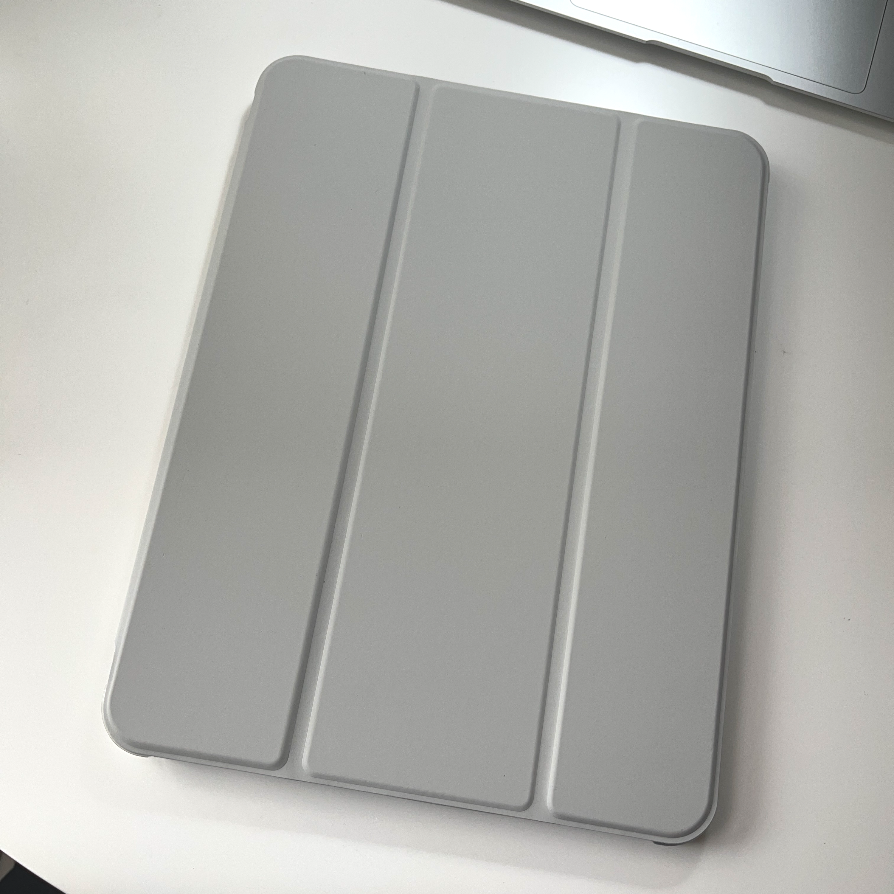 케이스를 끼운 후 뒷면 모습입니다. 그레이 색상이 실버 아이패드와 잘 어울렸어요! 보호색처럼 찰떡이라 군더더기 없이 깔끔한 모습입니다.