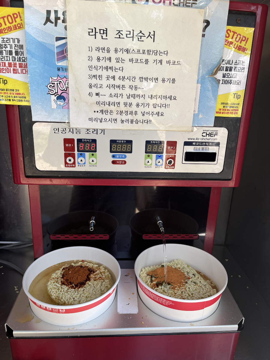 산책을 했으니 배가 고파졌습니다! 인천대공원 매점에는 한강라면이 있더라구요. 그래서 점심도 먹을겸 한강라면을 끓여먹어봤습니다. 근데 주말이라 그런가 사람이 엄청 많아요 ㅋㅋㅋㅋ 그리고 쓰레기통이 조금 멀었다는 점이 아쉬웠네요.. 하지만 라면은 맛있었습니다.