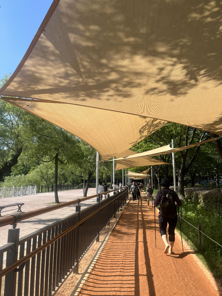 이렇게 직선으로 된 황톳길이 있어요. 황토 느낌이 너무 좋았고 그늘막이 쳐 있어서 걸어다니기 너무 좋았어요. 길이가 막 그렇게 길진 않지만 우측통행으로 왔다갔다하며 걸으니 좋더라구요!