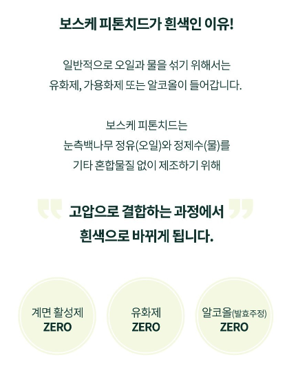 그런데 보스케 제품은 어떻게 다른 혼합물질 없이 피톤치드 오일과 정제수로만 섞어 만들 수 있었을까요?