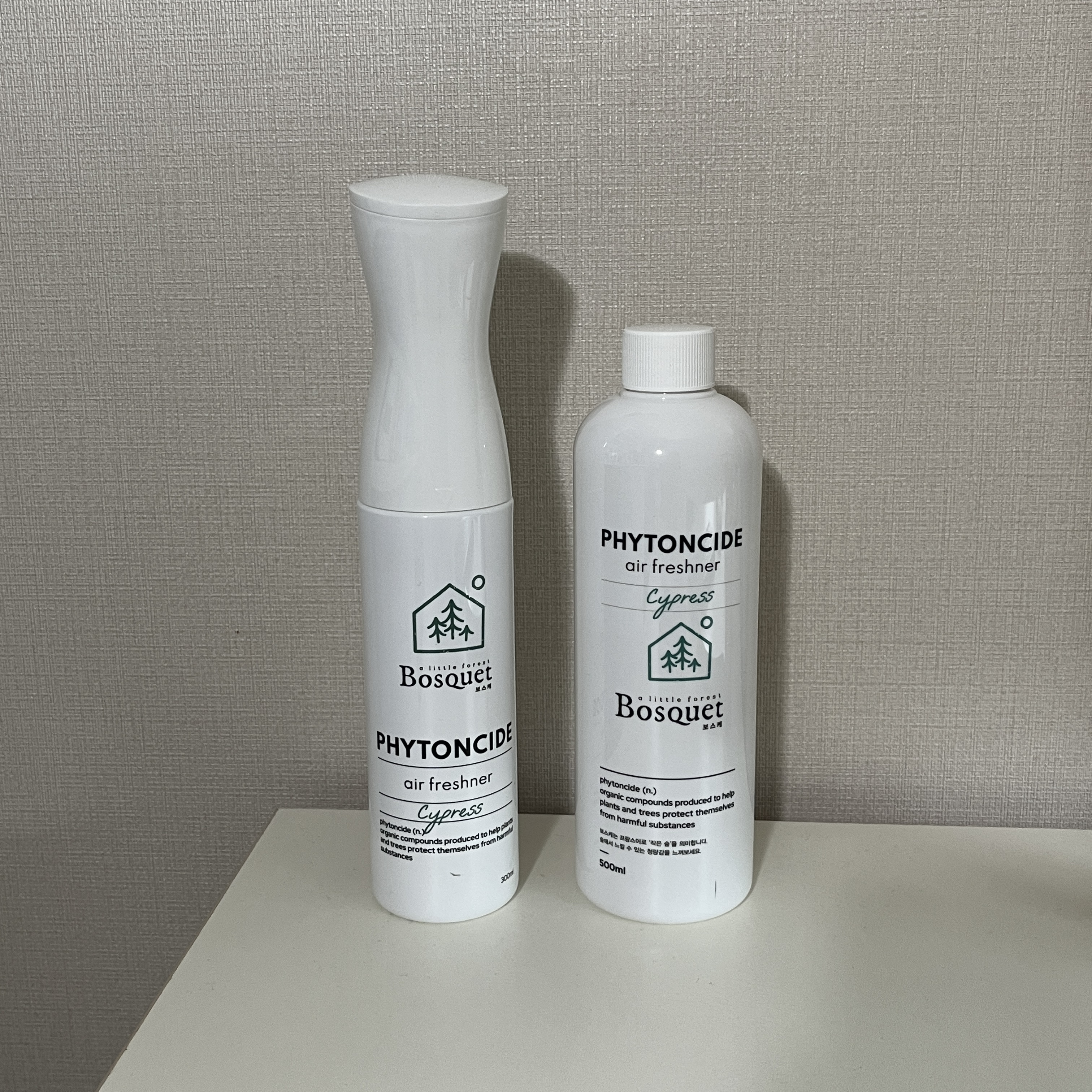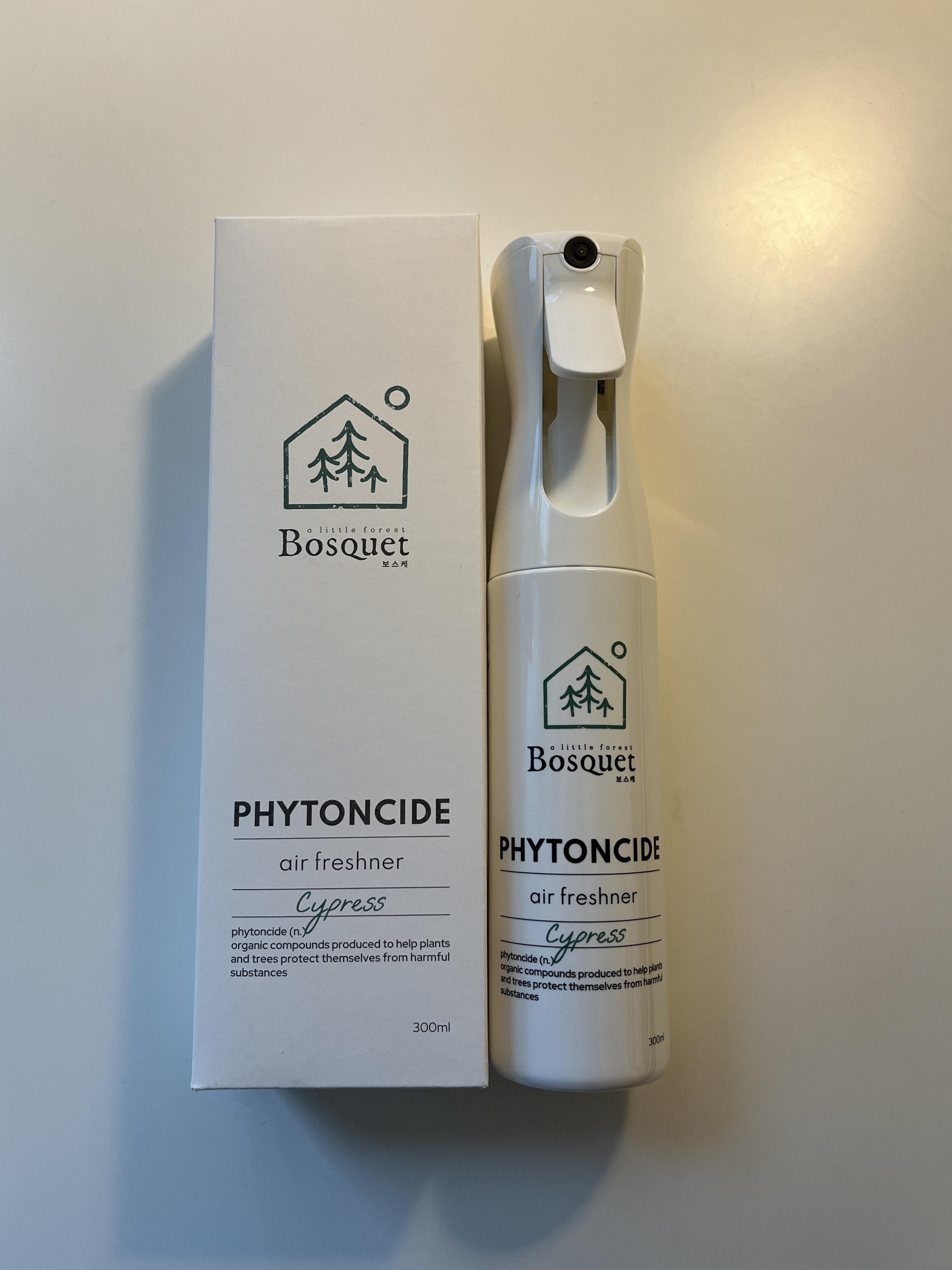 제가 사용하고 있는 제품은 <보스케 피톤치드>로 왼쪽은 안개분사형 스프레이 본품이며, 오른쪽은 리필형 제품입니다. 보스케(Bosquet)는 '작은 숲'이라는 뜻으로 보스케 피톤치드 제품은 "내 손안의 작은 숲"을 컨셉으로 하고 있네요.