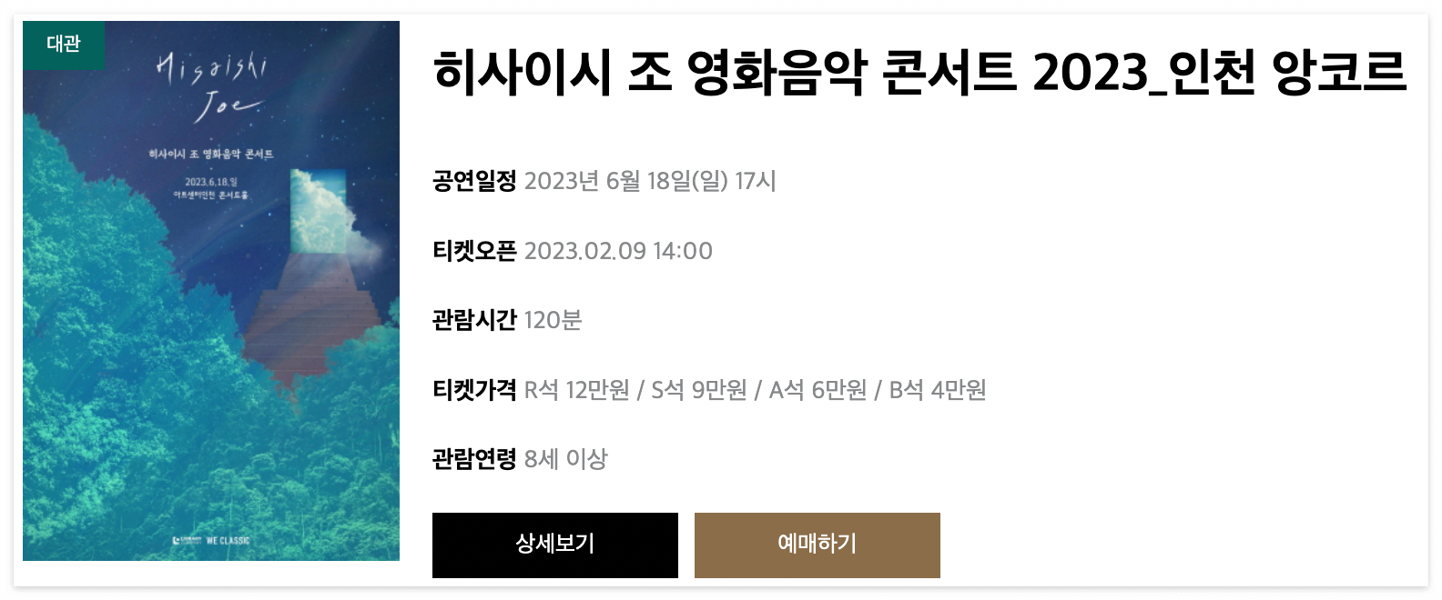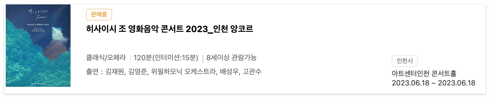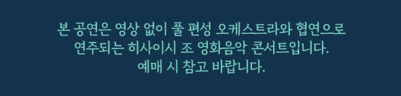 이 콘서트는 전국에서 진행이 되었었는데요. 그때 반응이 너무 좋아 이번에 다시 인천에서 앙코르 공연이 열립니다. 저도 저번에 트리오 연주로 히사이시조 음악 콘서트를 보았었는데 너무 좋아서 오케스트라 연주를 듣고 싶었어요. 근데 이미 공연이 마감된 후라 못 가나 싶어서 걱정했는데 다행히 앙코르 공연이 있는 것을 보고 저도 바로 예매했습니다.