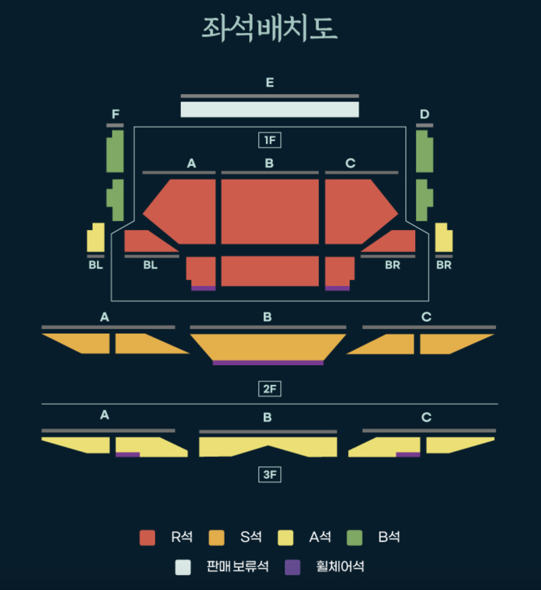 티켓 가격은 R석 12만원, S석 9만원, A석 6만원, B석 4만원이며 좌석배치도는 왼쪽의 사진을 참고해주시기 바랍니다. 물론 좋은 좌석에서 보면 가장 좋겠지만 인천아트센터가 어디에서나 음악을 잘 감상할 수 있도록 설계되어 있다고 하니 어디서든 잘 들릴 것으로 생각됩니다.