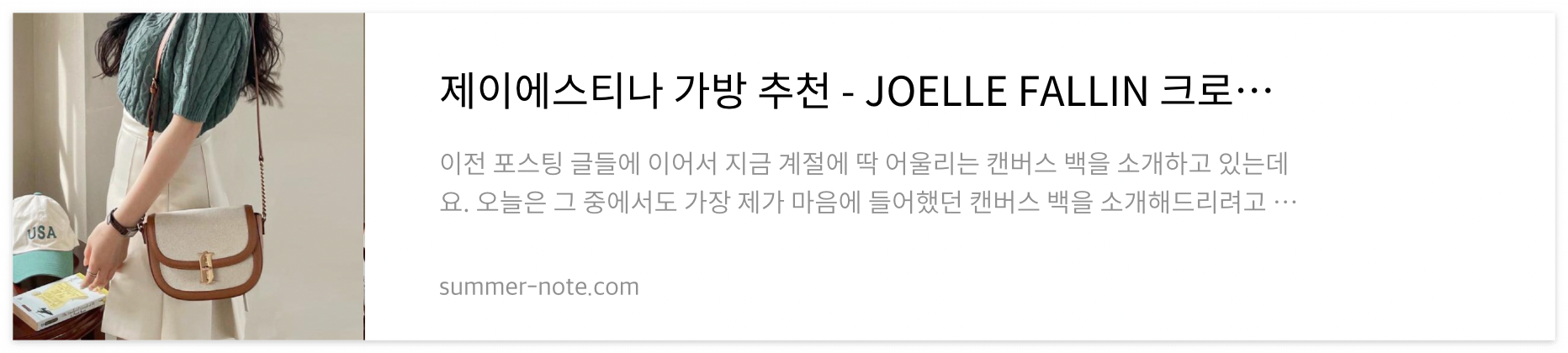 | 제이에스티나 가방 추천 - JOELLE FALLIN 크로스 캔버스백 브라운 (0) | 2023.04.23 |