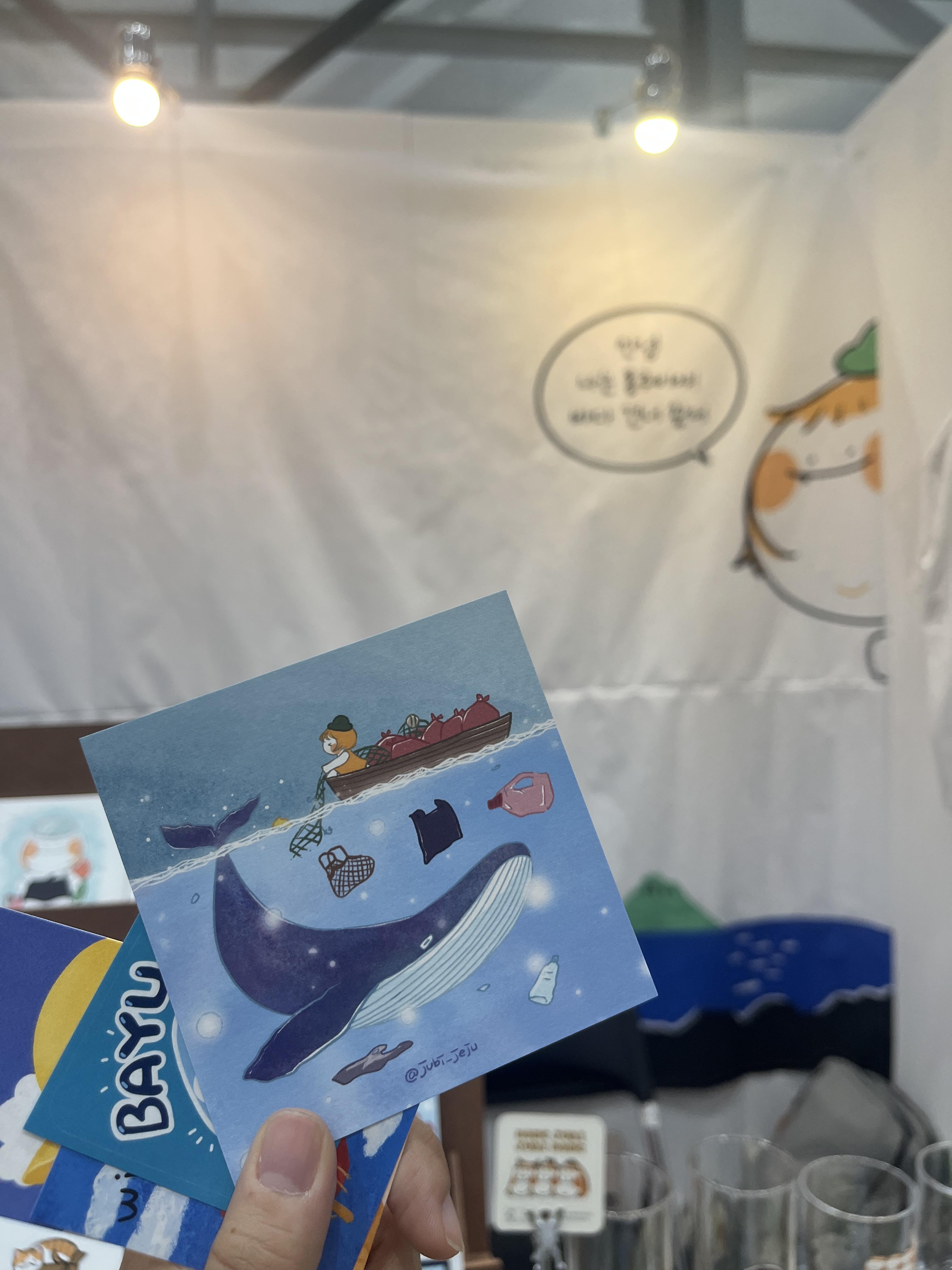 이 엽서는 친구가 사 준 <홍주비> 작가님 엽서..! 홍주비작가님은 제주도 바다 환경에 관심이 많으셨고 쓰레기를 줍는 플로깅 활동도 하신다고 한다. 그래서 바다에 있는 유리쓰레기를 모티브로 한 바유 캐릭터도 있었다ㅠㅠ 마음이 너무 따스했고 진심인 것이 느껴져서 감동이었다.