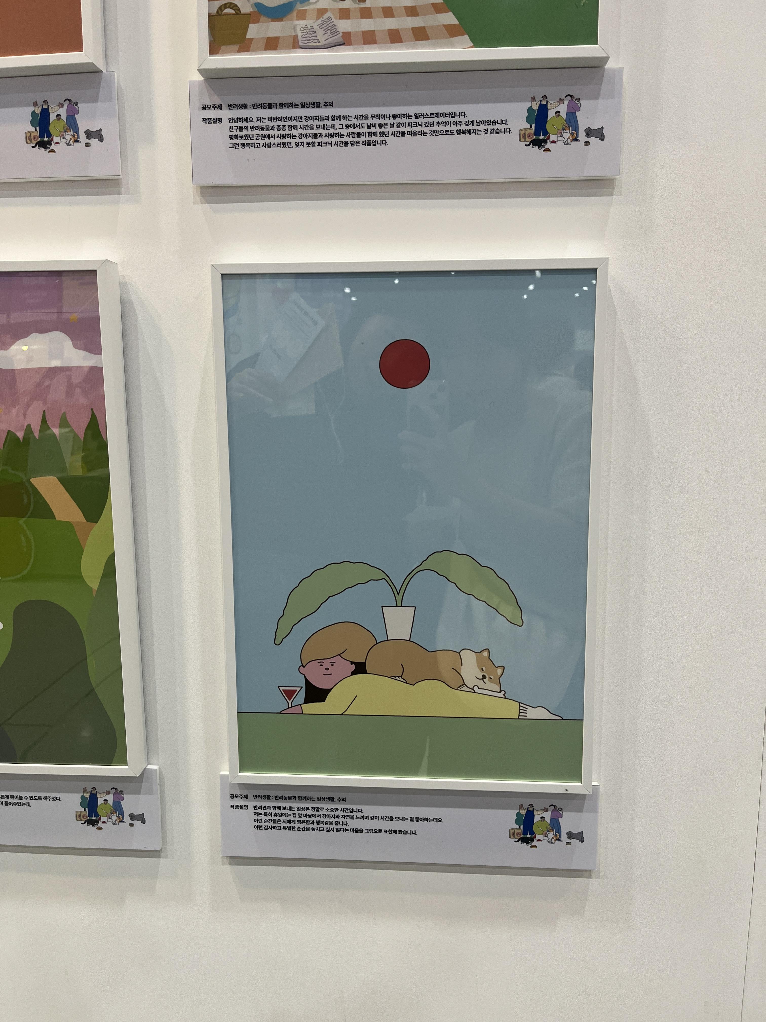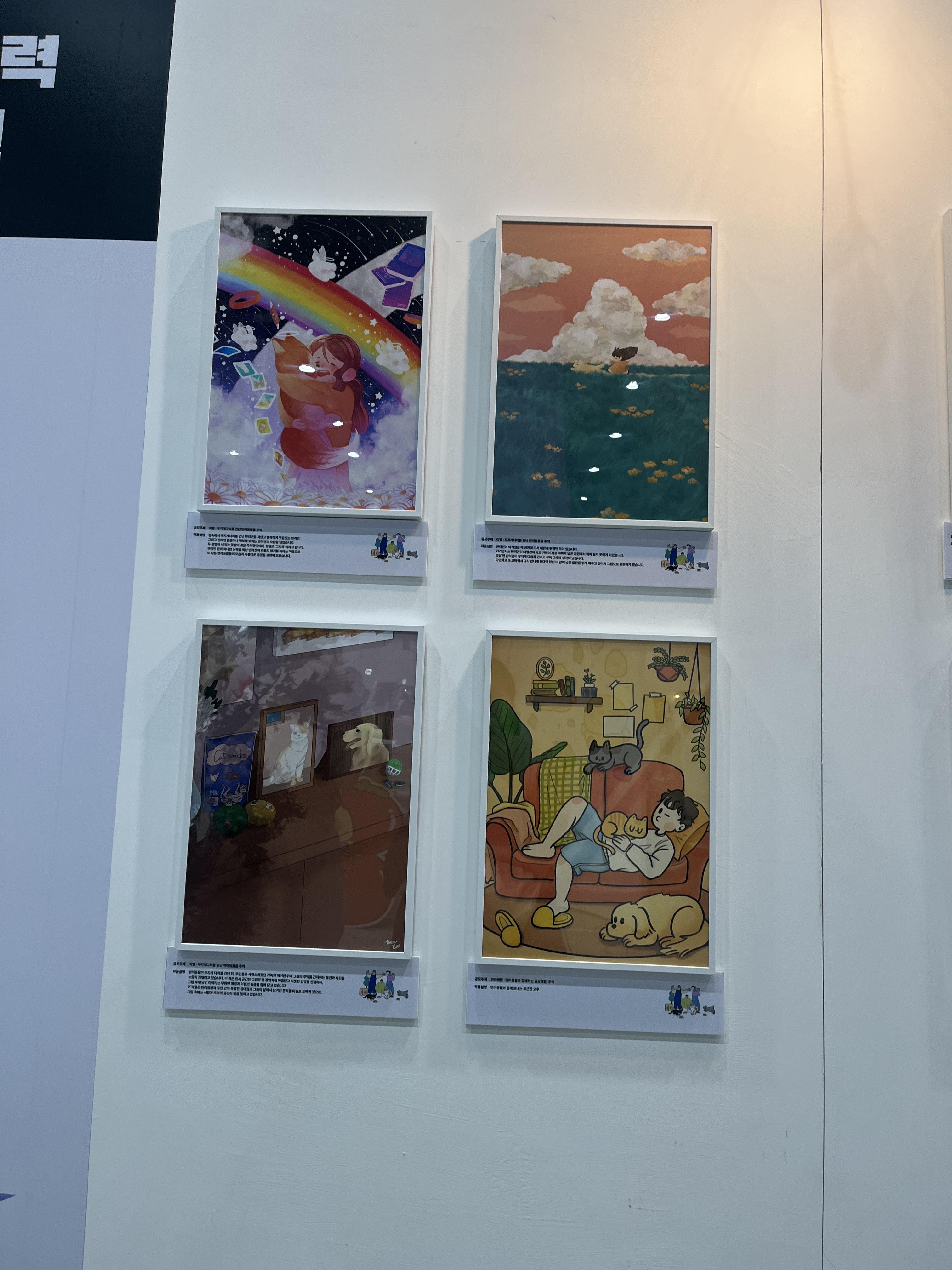 전시회장 벽면에는 이렇게 공모전이 진행되고 있다. 주제는 <반려동물과의 추억> 이다. 주제답게 가슴뭉클한 작품들도 많았다ㅠㅠ 옆에 있는 큐알코드를 통해 자신이 가장 마음에 드는 작품에 투표할 수 있다.